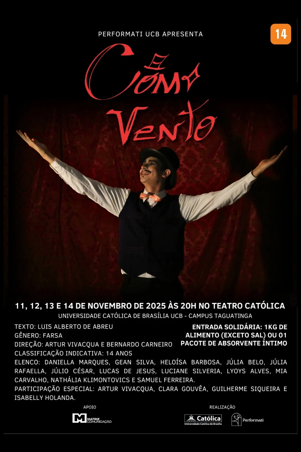 O PEFORMATI — Projeto de Arte e Cultura da Universidade Católica de Brasília apresenta o espetáculo “Como Vento”, que estará em cartaz de 11 a 14 de novembro no Teatro Católica. Com texto de Luís Alberto de Abreu e direção de Artur Vivacqua e Bernardo Carneiro, a produção promove uma reflexão profunda sobre as memórias, afetos e despedidas que compõem a experiência humana.