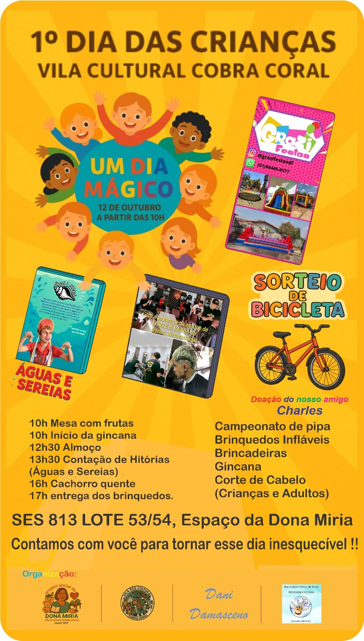 “A Vila Cultural Cobra Coral é um espaço de memória e afeto há mais de 55 anos. Esse dia será uma oportunidade de festejar a infância e fortalecer nossos laços comunitários, principalmente em meio aos desafios que estamos enfrentando para o reconhecimento desse espaço junto ao poder público ” , destaca Dudu Oliveira, idealizador do Ponto de Cultura Waldir Azevedo e maestro da Orquestra de Cavaquinhos de Brasília.